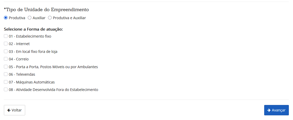 Na próxima tela, você deverá indicar a Forma de Atuação/Tipo de Unidade desejada para a empresa após a alteração.